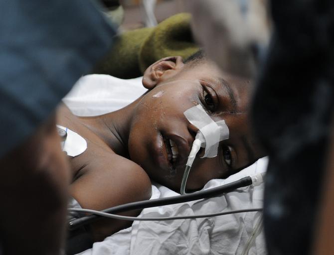Keywords: Operation Unified Response DVIDS241591.jpg en Medical professionals aboard the Military Sealift Command hospital ship USNS Comfort treat a six-year-old Haitian boy in the casualty receiving room aboard the 1 000-bed hospital ship The boy transferred to Comfort by helicopter from the aircraft carrier USS Carl Vinson for treatment for an injury to his bladder and a hip fracture during an earthquake that struck Haiti Jan 12 The boy is in the intensive care unit aboard Comfort in stable condition Comfort is supporting Operation Unified Response a joint operation providing humanitarian assistance to Haiti 2010-01-19 Petty Officer 3rd Class Chelsea Kennedy https //www dvidshub net/image/241591 100119-N-+++++-125 2010-01-20 04 20 USNORTHCOM AT SEA PD-USGov-Military-Navy USS Carl Vinson CVN-70 Operation Unified Response Images from DoD uploaded by Fæ |