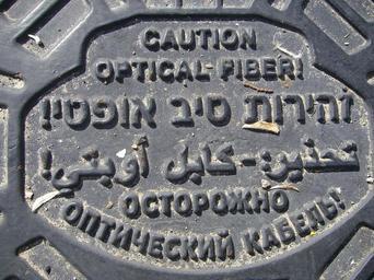 | Keywords: Optical cable manhole cover in English, Hebrew, Arabic and Russian in Tel Aviv, Israel.jpg en The manhole cover in Tel Aviv Israel with the warning 'Caution optical fiber cable' given in four languages anmely English Hebrew Arabic and Russian own Hyrdlak 2013-01-17 Cc-zero Manhole covers in Israel |