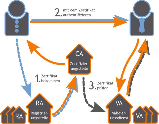 | Keywords: Orange blue public key infrastructure 2 de.svg en Principle of a public key infrastructure A user applies for a certificate with his public key at a registration authority RA The latter confirms the user's identity to the certification authority CA which in turn issues the certificate The user can then digitally sign a contract using his new certificate His identity is then checked by the contracting party with a validation authority VA which again receives information about issued certificates by the certification authority de Prinzip einer Public-Key-Infrastructure Teilnehmer authentifiziert sich gegenüber Registrierungsstelle diese bestätigt den öffentlichen Schlüssel des Teilnehmers gegenüber der Zertifizierungsstelle Die Zertifizierungsstelle stellt dem Teilnehmer ein Zertifikat aus Der Teilnehmer kann sich gegenüber einer anderen Person/Entität mit dem Zertifikat authentifizieren Die andere Person/Entität kann das Zertifikat von einem Validierungsdienst überprüfen lassen 2012-06-15 own Bananenfalter <gallery> File Public-Key-Infrastructure svg Original version File Orange blue public key infrastructure 2 de text svg Translateable version </gallery> Similar Images <gallery> File Orange blue public key infrastructure 1 de svg PKI without text File Orange blue public key infrastructure 3 de svg PKI detail registration File Orange blue public key infrastructure 4 de svg PKI detail verification </gallery> cc-zero Uploaded with UploadWizard Orange blue cryptography diagrams |