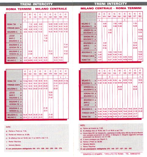 Keywords: Orario estivo 1987 - Treni Intercity Milano-Roma.gif it Treni Intercity Milano-Roma nell ™orario estivo 1987 delle Ferrovie dello Stato <br/> Con l'orario estivo 1987 il servizio sulla linea Milano-Roma fu rivoluzionato l'offerta di un treno Intercity ogni ora al posto di tre TEE un rapido e qualche espresso offrì un salto di qualità paragonabile all'apertura della Direttissima Bologna-Firenze del 1934 <br/> Anche il tempo di percorrenza di 5 ore e 10 minuti fu un risultato notevole a Direttissima Firenze-Roma ancora incompleta e con velocità massima di 200 km/h 1987 http //www stagniweb it/libri/o87rm gif Ferrovie dello Stato other versions Custom license marker 2016 08 20 PD-scan Train timetables in Italy 1987 in rail transport in Italy InterCity Italy Stagniweb |