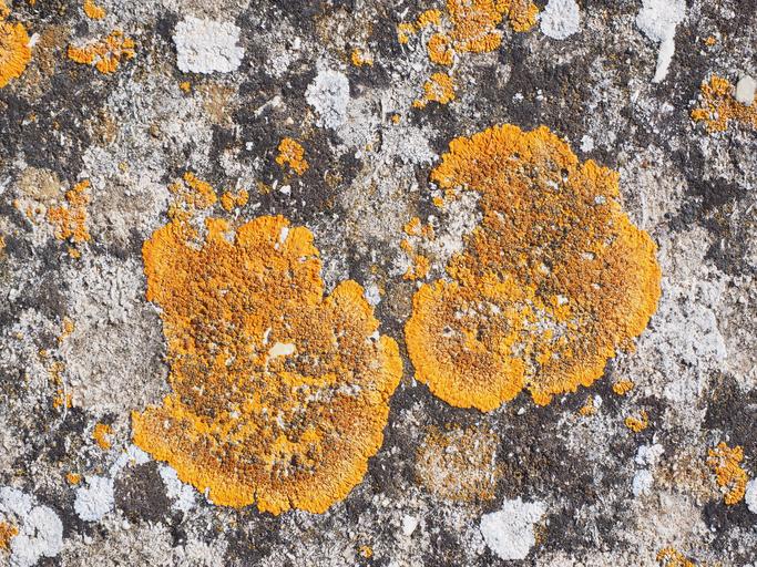 Keywords: ordinary gelbflechte xanthoria parietina stone weave orange leaf shaped lichen broad lobed leaf braid yellow ocher crust lichen lichen growth grey parellflechte ochrolechia parella cake braid tephromela atra