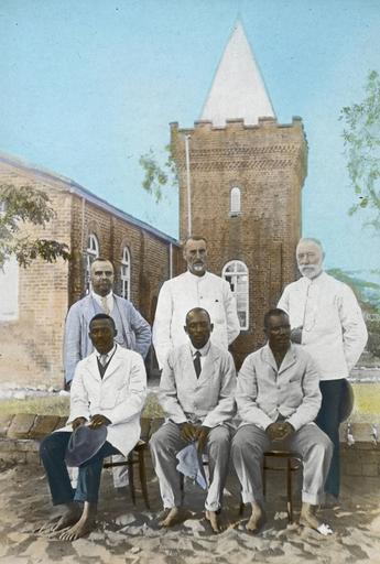 Keywords: Ordination of First Three Pastors, Livingstonia, Malawi, ca. 1895-ca. 1915 (imp-cswc-GB-237-CSWC47-LS5-1-051).jpg en <br> Ordination of First Three Pastors Livingstonia Malawi ca 1895-ca 1915 Photograph of the ordination of the first three pastors of Livingstonia Malawi The three pastors are seated with Dr Robert Laws and two other Missionaries standing behind The group are pictured outside a red brick church Red brick buildings are characteristic of Livingstonia Livingstonia was founded in 1894 by missionaries from the Free Church of Scotland ; This belongs to a series of Church of Scotland Foreign Missions Committee lantern slides relating to Dr Robert Laws 1851-1934 the Scottish Missionary In 1875 inspired by David Livingstone 1813-1873 Laws travelled to Malawi and was involved in the foundation of the mission station of Livingstonia on the shores of Lake Nyasa During the succeeding 50 years he also established a network of hundreds of schools In 1908 Laws was elected moderator of the General Assembly of the United Free Church of Scotland Photographer Unknown Subject personal name Laws Robert 1851-1934 Filename imp-cswc-GB-237-CSWC47-LS5-1-051 tif Coverage date 1895/1915 Part of collection International Mission Photography Archive ca 1860-ca 1960 Type images Part of subcollection Photographs from the Centre for the Study of World Christianity University of Edinburgh U K ca 1900-ca 1940s Repository name Centre for the Study of World Christianity Archival file impaunpub_Volume7/1555 url Repository address The University of Edinburgh School of Divinity New College Mound Place Edinburgh EH1 2LX United Kingdom Geographic subject country Malawi Format aacr2 1 lantern slide 8 x 8 cm Geographic subject continent Africa Rights Contact the repository for details Part of series Laws of the Pioneer LS5/1 Repository email divinity-CSWC ed ac uk Subject lcsh Keyword Clergy Date created 1895/1915 Publisher of the digital version University of Southern California Libraries Subject aat genre group portraits Format aat lantern slides Legacy record ID impa-m68638 Access conditions http //www ed ac uk/schools-departments/divinity/research/centres/world-christianity/collections-resources File GB 237 CSWC47/LS5/1/51 1895/1915 author http //digitallibrary usc edu/cdm/ref/collection/p15799coll123/id/64675 PD-old-70-1923 Magic lantern images Images from USC Digital Library uploaded by Fæ International Mission Photography Archive ca 1860-ca 1960