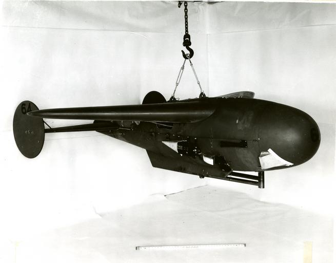 Keywords: OrdnanceWorldWarII 047.jpg The Pelican was developed concurrently with the Bat by NBS the Navy Bureau of Ordnance and the MIT Radiation Laboratory The Pelican is shown with instrumentation for field testing Directly beneath the wing shown in the photo was mounted a 16mm Bell and Howell Type M-4A gun sight aiming point camera Slightly forward and lower was mounted a 16mm Cine Kodak Model E camera The housing on the nose covered a panel of signal lamps indicating the application of radar controls The cameras simultaneously photographed the panel and the ground ahead of the glider National Institute of Standards and Technology National Institute of Standards and Technology PD-USGov-NIST PD-USGov SWOD Mk-7 Pelican |
