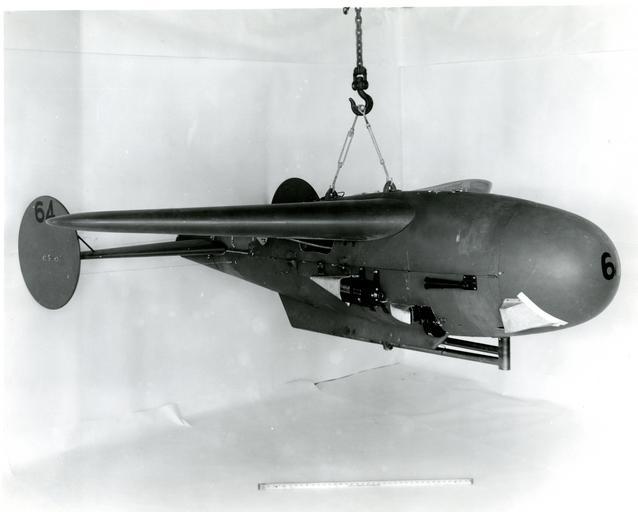 Keywords: OrdnanceWorldWarII 048.jpg The Pelican was developed concurrently with the Bat by NBS the Navy Bureau of Ordnance and the MIT Radiation Laboratory The Pelican is shown with instrumentation for field testing Directly beneath the wing shown in the photo was mounted a 16mm Bell and Howell Type M-4A gun sight aiming point camera Slightly forward and lower was mounted a 16mm Cine Kodak Model E camera The housing on the nose covered a panel of signal lamps indicating the application of radar controls The cameras simultaneously photographed the panel and the ground ahead of the glider National Institute of Standards and Technology National Institute of Standards and Technology PD-USGov-NIST PD-USGov SWOD Mk-7 Pelican Bell Howell |