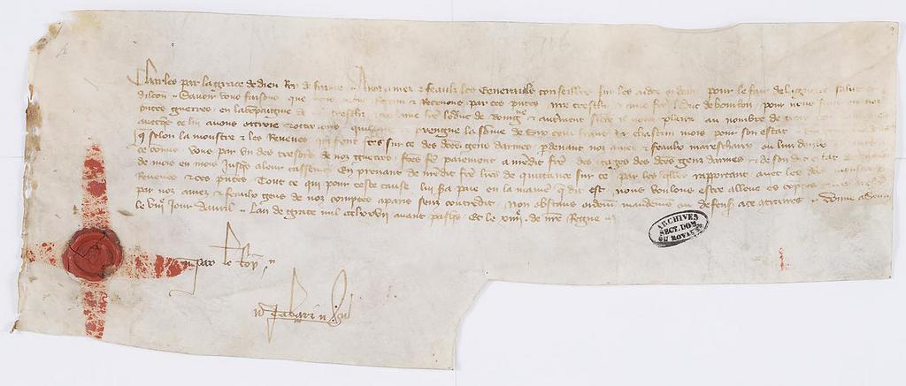 Keywords: Ordre de paiement délivré par Charles V pour les gages d’une compagnie de gens de guerre. - Archives Nationales - AE-II-399.jpg Ordre de paiement délivré par Charles V pour les gages d ™une compagnie de gens de guerre Senlis 8 avril 1378 1378-04-08 parchment Institution Archives nationales France AE/II/399 object history exhibition history credit line Archives Nationales cooperation project PD-old-100-1923 accession number AE/II/399 P//1377/1/2865 Collections of Archives nationales France 1378 in FranceMedia contributed by the Archives Nationales France /5 Charles V of France |