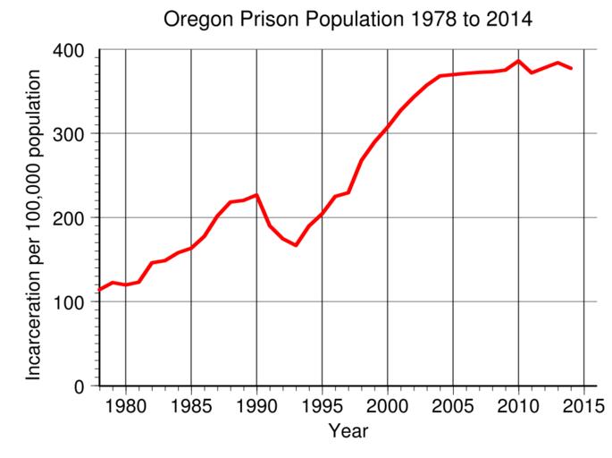 Keywords: Oregon Prison Population.svg en Oregon prison incarceration rate per 100 000 population from 1978 to 2014 Data from http //www bjs gov/index cfm ty nps BJS 2016-05-11 own Delphi234 other versions current annually Generated with Wikimedia SVG Chart SVG Chart/box cc-zero Prisons in Oregon Imprisonment and detention rates in the United States |