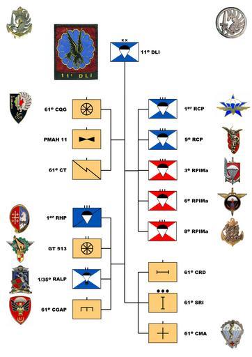 Keywords: Organigramme 11e DLI.jpg fr Organigramme symbole Otan et insignes de la 11e division légère d'intervention française entre le 1er mai 1961 et le 30 novembre 1963 Cf revue uniformes n° 278 sept-oct 2011 page 30 2011-10-01 own BrunoLC cc-zero Uploaded with UploadWizard Military OrBat Graphics/France |