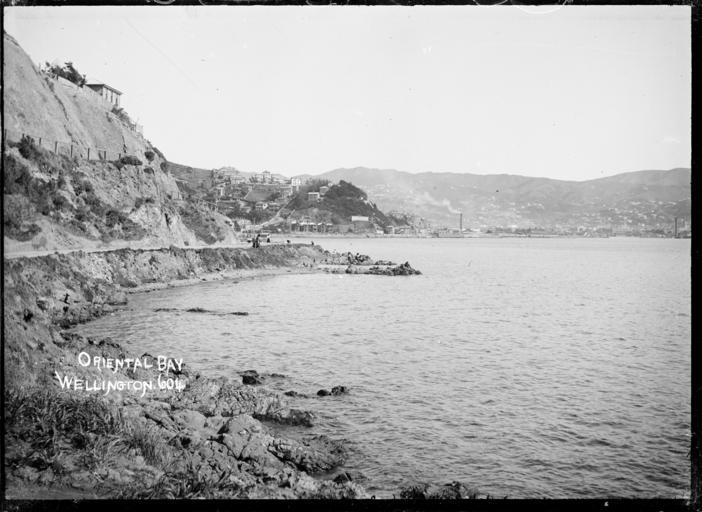 Keywords: blackandwhite monochrome outdoor photo border shore landscape coast serene water sea black and white View taken from Oriental Parade with Carlton Gore Road on the left and Lambton Harbour on the right, looking towards the city area and hill suburbs in the distance. Children are standing on the rocky foreshore in the middle distance. A house overlooking Oriental Bay (on Carlton Gore Road) is visible in the top left. Houses under construction on Oriental Parade can be seen in the distance. A large sign advertising `Nelson Teas [?]' can be seen on the hillside in the middle distance near the houses under construction. Photograph taken ca 1906 when these houses are known to have been constructed, by William Archer Price. Inscriptions: Inscribed - Photographer's title on negative -bottom left: Oriental Bay. Wellington. 604. Quantity: 1 b&w original negative(s). Physical Description: Dry plate glass negative 4.75 x 6.5 inches Oriental Bay, Wellington. Price, William Archer, 1866-1948 :Collection of post card negatives. Ref: 1/2-001612-G. Alexander Turnbull Library, Wellington, New Zealand. natlib.govt.nz/records/22813544 View taken from Oriental Parade with Carlton Gore Road on the left and Lambton Harbour on the right, looking towards the city area and hill suburbs in the distance. Children are standing on the rocky foreshore in the middle distance. A house overlooking Oriental Bay (on Carlton Gore Road) is visible in the top left. Houses under construction on Oriental Parade can be seen in the distance. A large sign advertising `Nelson Teas [?]' can be seen on the hillside in the middle distance near the houses under construction. Photograph taken ca 1906 when these houses are known to have been constructed, by William Archer Price. Inscriptions: Inscribed - Photographer's title on negative -bottom left: Oriental Bay. Wellington. 604. Quantity: 1 b&w original negative(s). Physical Description: Dry plate glass negative 4.75 x 6.5 inches Oriental Bay, Wellington. Price, William Archer, 1866-1948 :Collection of post card negatives. Ref: 1/2-001612-G. Alexander Turnbull Library, Wellington, New Zealand. natlib.govt.nz/records/22813544