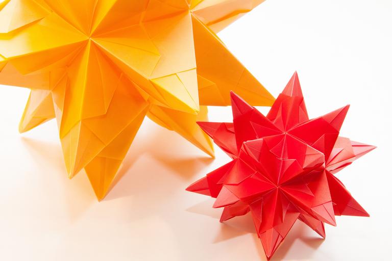 Keywords: origami art of paper folding fold 3 dimensional object star large small geometric bodies yellow red matt shiny