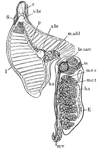 Keywords: Origin of Vertebrates Fig 065.png Fig 65 ”Section through Branchial Appendage of AmmocĹ“tes br cart branchial cartilage; v br branchial vein; a br branchial artery; b s blood-spaces; p pigment; S sense-organ; c ciliated band; E I external and internal borders; m add adductor muscle; m c s striated constrictor muscle; m c t tubular constrictor muscle; m and m v muscles of valve All references in this work to AmmocĹ“tes or Petromyzon appear to refer to the European Brook Lamprey now called Lampetra planeri 1908 The Origin of Vertebrates https //archive org/details/originofvertebra1908gask Walter Holbrook Gaskell PD-old-auto-1923 1914 Origin of Vertebrates book Lampetra planeri |