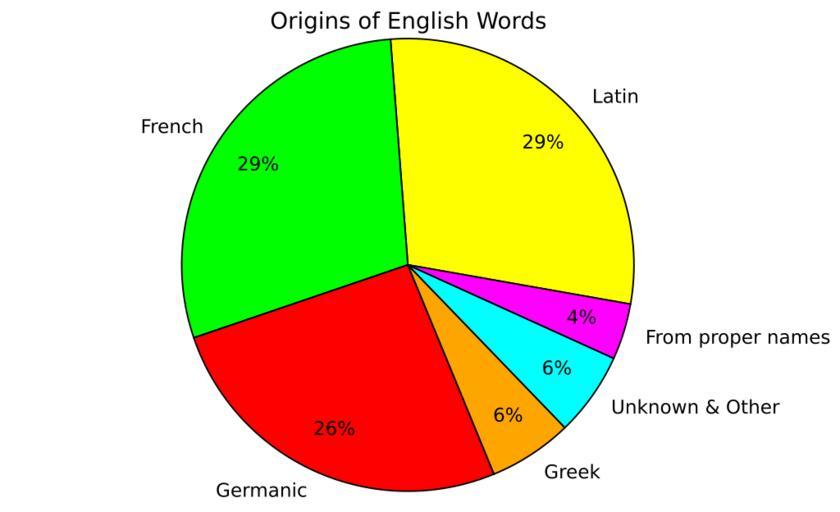 | Keywords: Origins of English Words.svg en This graph shows the origin of words in the English language The data used is the same as File Origins of English PieChart svg which is to say it's drawn from data on AskOxford com in 2007 2015-09-06 own Douglas Perkins other versions The SVG file was produced using MatPlotLib with the following also Public Domain code <pre> /usr/bin/env python from matplotlib import pyplot from matplotlib import ticker from matplotlib import numpy This generates a pie graph showing the origins of words in the English language The data was taken from AskOxford com in 2007 https //commons wikimedia org/wiki/File Origins_of_English_PieChart svg data Latin 29 French 29 Germanic 26 Greek 6 Unknown Other 6 From proper names 4 languages d0 for d in data percents d1 for d in data Make a pie graph colors 'yellow' 'lime' 'red' 'orange' 'cyan' 'magenta' pyplot figure num 1 figsize 9 5 pyplot axes aspect 1 pyplot title 'Origins of English Words' pyplot pie percents labels languages autopct ' 1 f ' colors colors pctdistance 0 8 startangle -10 pyplot axis 'equal' pyplot savefig 'Origins of English Words svg' format 'svg' bbox_inches 'tight' </pre> cc-zero Uploaded with UploadWizard History of the English language SVG pie charts |