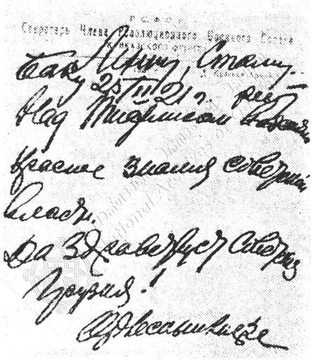 | Keywords: Orjonikidze telegram 1921. National Archives of Georgia.jpg Sergo Orjonikidze to Lenin and Stalin on the day of occupation of Tbilisi the capital of Georgia on 25 February 1925 The text reads in Russian Ленину Сталину Баку 25 II 21 г ад Тифлисом еет К асное Знамя Советской Власти Да Зд авствуйет Советская Г узия О джоникидзе To Lenin Stalin Baku 25 II 21 The Red Flag of Soviet Power Flies over Tiflis Long Live Soviet Georgia Orjonikidze 1921 http //archives gov ge/ge/page/sergo-ordjonikidzis-depesha-lenins-da-stalins National Archives of Georgia n/a other versions Custom license marker 2015 04 27 PD-Old-70 Uploaded with UploadWizard Red Army invasion of Georgia Telegrams of the Soviet Union Telegrams of Russia Sergo Ordzhonikidze National Archives of Georgia |