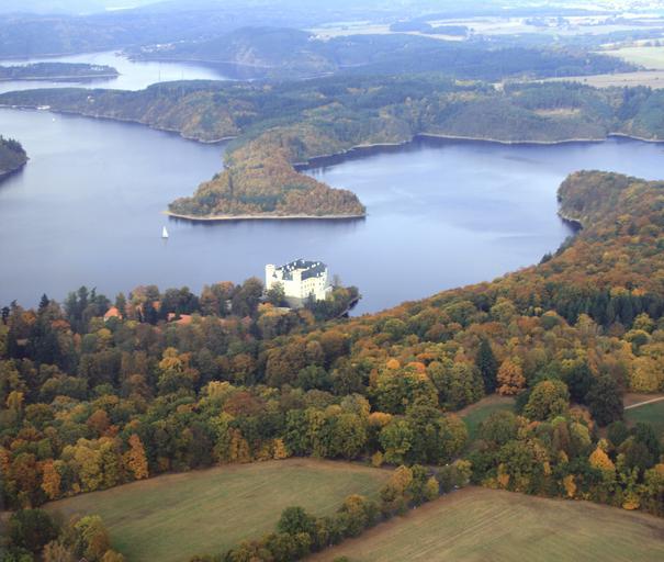 Keywords: Orlík 6.jpg Orlík Chateau on Orlík dam on Vltava river the Czech Republic zámku Orlík na břehu Orlické přehrady na řece Vltavě střední Čechy own Karelj 2009-10 49 30 30 05 N 14 10 1 54 E Orlík Reservoir Aerial photographs of Orlík
