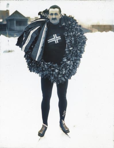 Keywords: lysbilder kjente personer kjentepersoner idrettsutøvere aktiviteter idrett idrettsanlegg skøytebaner portretter norge Dias. Portrett av skøyteløperen Oscar Mathisen stående på skøyter på isen med en stor krans om halsen. Dias. Portrett av skøyteløperen Oscar Mathisen stående på skøyter på isen med en stor krans om halsen. |