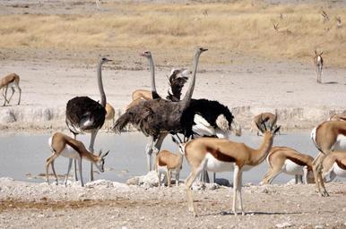 Keywords: ostrich birds flightless bird antelope springbok watering hole africa safari namibia etosha water drink potions animal