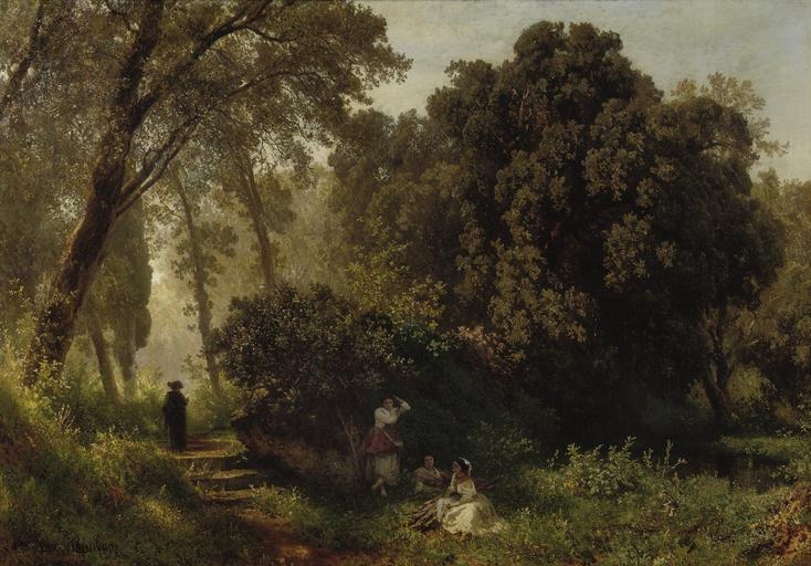 Keywords: oswald achenbach painting art artistic artistry oil on canvas landscape sky clouds nature outside country countryside trees scenic women forest woods summer spring