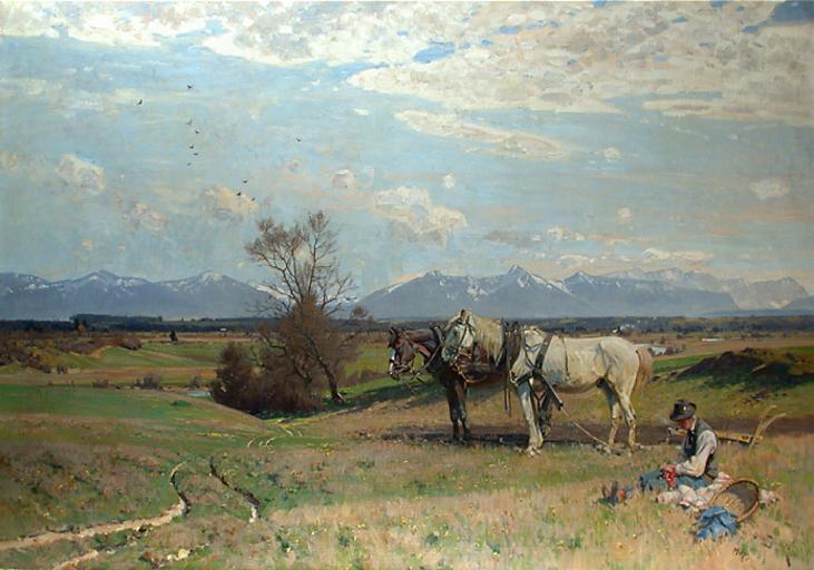 | Keywords: Otto Strützel Pflügender Bauer bei der Rast.jpg  Pflügender Bauer bei der Rast Oil on canvas 103 x 148 cm Creator Otto Strützel Paintings of horse-drawn plows Agriculture in art Paintings of peasants Peasants in early 20th century Resting in art Plowing with horses Otto Strützel Wilhelmine Germany PD-old-auto 1930  |