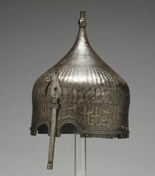 Keywords: Ottoman or Persian - Turban Helmet with Eye Holes - Walters 5170 - Three Quarter Left.jpg A warrior would have worn this helmet over a cloth turban He would have been confident of being safeguarded in battle by the writing around the helmet's rim The inscription from the Qur'an is garbled however indicating that its Iranian maker may not have known Arabic Yet the presence of Arabic writing apparently was thought to be enough to invoke the protective power of God's word This helmet once belonged to the St Irene royal arsenal in Istanbul Turkey as it bears the distinctive mark tamga composed of a circle enclosing a loop over three vertical lines the stamp is clearly visible to the left of the nose guard on this helmet It was probably part of the war booty amassed by the Ottoman Dynasty during the many wars between Turkey and Iran Later it was owned by the French painter Jean-Léon Gérôme who traveled throughout the Near East and painted many scenes of Muslim life ca 1450 1500 late Medieval steel with silver inlay cm 38 5 23 4 h x diam accession number 51 70 6002 Armory of Constantinople Jean-Léon Gérome Collection Dikran Kelekian New York and Paris Henry Walters city Baltimore Walters Art Museum Henry Walters Acquired by Henry Walters 1913 place of origin east Turkey Ottoman or northwest Iran Persia Walters Art Museum license Islamic metalwork in the Walters Art Museum Indo-Persian armour in the Walters Art Museum Media contributed by the Walters Art Museum needs artist review 15th-century helmets Turban helmets |