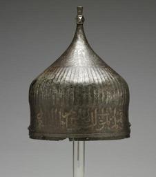 | Keywords: Ottoman or Persian - Turban Helmet with Eye Holes - Walters 5170 - Back.jpg  A warrior would have worn this helmet over a cloth turban He would have been confident of being safeguarded in battle by the writing around the helmet's rim The inscription from the Qur'an is garbled however indicating that its Iranian maker may not have known Arabic Yet the presence of Arabic writing apparently was thought to be enough to invoke the protective power of God's word This helmet once belonged to the royal arsenal in Istanbul Turkey It was probably part of the war booty amassed by the Ottoman Dynasty during the many wars between Turkey and Iran Later it was owned by the French painter Jean-Léon Gérôme who traveled throughout the Near East and painted many scenes of Muslim life ca 1450 1500 late Medieval steel with silver inlay cm 38 5 23 4 h x diam accession number 51 70 6002 Armory of Constantinople Jean-Léon Gérome Collection Dikran Kelekian New York and Paris Henry Walters city Baltimore Walters Art Museum Henry Walters Acquired by Henry Walters 1913 place of origin east Turkey Ottoman or northwest Iran Persia Walters Art Museum license Islamic metalwork in the Walters Art Museum Indo-Persian armour in the Walters Art Museum Media contributed by the Walters Art Museum needs artist review 15th-century helmets Turban helmets |