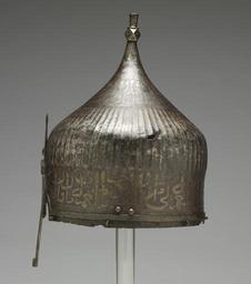 | Keywords: Ottoman or Persian - Turban Helmet with Eye Holes - Walters 5170 - Left.jpg  A warrior would have worn this helmet over a cloth turban He would have been confident of being safeguarded in battle by the writing around the helmet's rim The inscription from the Qur'an is garbled however indicating that its Iranian maker may not have known Arabic Yet the presence of Arabic writing apparently was thought to be enough to invoke the protective power of God's word This helmet once belonged to the royal arsenal in Istanbul Turkey It was probably part of the war booty amassed by the Ottoman Dynasty during the many wars between Turkey and Iran Later it was owned by the French painter Jean-Léon Gérôme who traveled throughout the Near East and painted many scenes of Muslim life ca 1450 1500 late Medieval steel with silver inlay cm 38 5 23 4 h x diam accession number 51 70 6002 Armory of Constantinople Jean-Léon Gérome Collection Dikran Kelekian New York and Paris Henry Walters city Baltimore Walters Art Museum Henry Walters Acquired by Henry Walters 1913 place of origin east Turkey Ottoman or northwest Iran Persia Walters Art Museum license Islamic metalwork in the Walters Art Museum Indo-Persian armour in the Walters Art Museum Media contributed by the Walters Art Museum needs artist review 15th-century helmets Turban helmets |