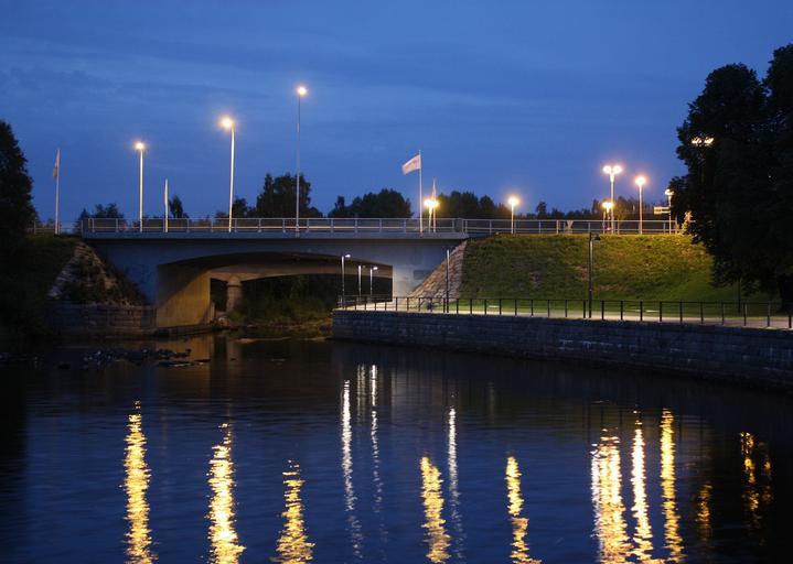 Keywords: oulu finland city cities urban bridge river water waterway night evening reflections shoreline outside