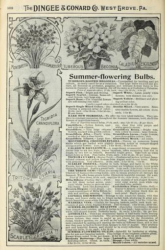 Keywords: Our new guide to rose culture (15951574123).jpg 102 IBeDINGEESCONARD WESTERovE pA <br> ' ' osMijiEFtoR Tuberous <br> Summer f lowering Bulbs <br> TUBEROUS-ROOTED BEGONIAS ” Unsurpassed for bedding and pot <br> culture As easily eared for as a Geranium The large bulbs we send out pro- <br> duce all Summer in profusion gorgeous and brilliant flowers three to tive <br> inches in diameter After blooming dry off the same as a Gladiolus or Tuberose <br> Price of separate colors 15 cts each; any Ufor 50 cts ; 9 for 1 <br> Superb Pink ” Bright and shining <br> Superb Scarlet ” Intense flame-col- <br> ored flowers very large size <br> Superb Rose ” The beautiful flowers <br> are soft shining rose color <br> Superb White ” Large pearly white <br> flowers; very distinct see cut <br> Superb Yellow ” Brilliant and glow- <br> ing yellow color <br> 1 each U superb colors described above for 50 cts <br> Superb Single Mixed Colors ” Em- <br> bracing a gorgeous array of colors <br> 10 cts each ; 3 for 25 cts ; 6 for 50 cts ; <br> f 1 per dozen <br> Double Mixed ” Very scarce Beau- <br> tiful double flowers all colors 25 cts <br> each; 5 for 81 <br> RARE NEW TIGRIDIAS ” We offer the very latest varieties They pro- <br> duce in constant succession throughout the Summer immense bold shell-like <br> flowers of marvelous beauty <br> Price of Tigridias named below 10 cts each; any 3 for 25 cts ; 1 per dozen <br> Concliiilora ”Yellow flowers spot- <br> ted with rich crimson <br> Grandiflora ” Very large crimson <br> flowers marked with golden yellow <br> Grandiflora Alba ” Pearly white <br> marked at base a clear brown <br> Grandiflora liilacea ” Large flow- <br> ers clear lilac with purple and <br> white spots in centre <br> Grandiflora Rosea ” Bright rose <br> rich yellow in centre ; large flowers <br> Grandiflora Aurea ” Large flowers; <br> pure deep golden yellow ; rich <br> Grandiflora Mixed ” All colors <br> MONTBRETIA CROCOSMI FL ORA ” Throws up numerous flower <br> stalks which re loaded with slightly drooping spikes of trumpet-shaped <br> orange-scarlet flowers 5 cts each ; 3 for 10 cts ; 10 for 25 cts <br> CAJLADIUM ESCULENTUM ” A magnificent ornamental foliage plant <br> Grows four to six feet high ; leaves immense often measaring four feet in <br> length by two feet in breadth Beautiful bright green Take bulb up when <br> killed down by frost Fine bulbs 10 cts each ; 3 for 25 cts ; fl per dozen <br> TRITOMA UVARIA Blazing Torr/t ” Produces tall spikes brilliant flame- <br> colored crimson and yellow flowers from August until severe frosts Hardy <br> with protection Very effective 20 cts each ; 3 for 50 cts ; 7 for 1 <br> SCARLET FREESIA ” Similar in bulb foliage and habit to the White <br> Freesia but the flowers in brilliant contrast are brightest scarlet lower petals <br> di tinctly blotched Eeally a grand bulb 5 cts each ; 3 for 10 cts ; 10 for 25 cts <br> THE THREE GEMS ” These are among the most delightful and most sat- <br> isfactory of Summer-flowering bulbs; sure to bloom profusely all throngh the <br> Summer We offer home-grown bulbs Flowers in beautiful contrast 20c a set <br> Price of Three Gems 10 cts each; any 3 for 20 cts ; 9 for 50 cts ; 15 for 15 cts <br> Milla Biflora Floating Star ” Flow- <br> ers full three inches across pure <br> waxy white ; borne in pairs on rush- <br> like stems Look like floating stars <br> Bessera Elegans Coral Drops ” An <br> exact counterpart of Milla Biflora in <br> rich and striking coloring Pendu- <br> lous clusters of bell-shaped flowers ; <br> color coral scarlet pure white cup <br> and dark blue anthers <br> Cyclobothra Flava Golden Shell ” <br> Similar to Bessera ; color clear golden <br> yellow with intense black dots on <br> each petal Easily grown <br> COPERIA DRUMMONDI ” Belongs to the Amaryllis family with fine <br> foliage and fiower stalks ten to fifteen inches high producing in great pro- <br> fusion beautiful snow-white Lily -like flowers 10 cts each ; 3 for 25c ; 8 for 50c <br> MADEIRA VINE ” Climber for hanging baskets trellis rock work etc <br> Clusters of pure white fragrant flowers Free bloomer 3 for 10 cts ; 10 for 25c <br> SUMMER-BLOOMING HYACINTH Hyacinthus Candicans ” Blooms <br> from August until October; grows 18 inches to 2 feet high ; large spikes of pure <br> white bell-shaped flowers Perfectly hardy 5c each; 6 for 25c ; 50c per doz <br> ANTHOLYZA ” This is an ornamental family of half-hardy bulbs bearing <br> a close resemblance to Gladiolus The prevailing colors are orange and scarlet <br> Grown indoors they come in useful as pot plants for the decoration of <br> rooms window gardens etc as well as for cutting Their blooming may be <br> more extended by potting and starting the bulbs at different times and in this <br> way they may be hยซd in flower from January to July or August They produce <br> rare and beautiful flowers and should be in every collection Fine mixed <br> Large size bulbs 15 cts each 4 for 50 cts <br> SUMMER-FLOWERING OXALIS ” Splendid for bordering or edging <br> also for pots and hanging baskets Fine foliage of the brightest possible green <br> Except where noted 15 cts per dozen; 50 for 25 cts ; 40 cts per hundred <br> Bermuda Buttercup ” New large- I Lasiandra - Rosy pink <br> flowering yellow Grand 5c each ; Dteppi ” Pure white <br> 6 for 25 cts ; 12 for 40 cts I Mixed Colors ” All varieties mixed 43875689 149643 77861 Page 102 Text http //www biodiversitylibrary org/page/43875689 1891 10 5962/bhl title 77861 Dingee Conard Co ; Henry G Gilbert Nursery and Seed Trade Catalog Collection NameFound Antholyza NameConfirmed Antholyza EOLID 5869910 NameBankID 3490360 NameFound Bessera NameConfirmed Bessera EOLID 60498 NameBankID 3409217 NameFound Biflora NameFound Cyclobothra NameConfirmed Cyclobothra NameBankID 4921974 NameFound Elegans NameConfirmed Elegans NameBankID 5116399 NameFound Grandiflora NameFound Grandiflora liilacea Nam