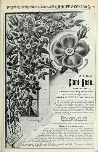 | Keywords: Our new guide to rose culture (16385771157).jpg i ThEleadinaRnsEErawEKsnfAniEKina llieOIMGEE SCONARD Q 39 <br> a» THE <br> Giant ose <br> ROSA GIGANTEA <br> A Wonderful New Climbing Rose from India <br> For Sale only by The Dingee Conard Co <br> GROWS 40 FEET IN ONE SEASON I <br> We believe that without exception this is one of <br> the most valuable and interesting Rose novelties <br> we have ever offered to the public This wonder <br> among Roses was sent to us from India that far eastern <br> land where almost impossible feats of legerdemain are <br> performed by the Hindustani magicians This Rose <br> must have originated at the hands of one of these <br> magicians inasmuch as its rapidity of growth is noth- <br> ing less than marvelous <br> Within a season yoting plants <br> grow as if by magic to the in- <br> cfedible height of 40 feet and over <br> It throws up numerous strong canes and bears large single <br> ~ Flowers 5 to 6 inches across <br> which in color are pure bright pink The flowers are very handsome <br> and of such immense size as to attract instant attention wherever <br> seen The foliage is ditferent from that of any Rose we have ever seen <br> ” very dark of medium size long and leathery and is singularly free <br> from all attacks of insects The growth foliage and flower of this variety <br> is totally unlike anything yet offered in Roses It is hardy with protection <br> We believe that it will adapt itself to any soil or climate As a new Rose possessing <br> extraordinary and valuable features we expect this variety to become exceedingly popular <br> You will make no mistake in planting it <br> J30 cts eacb ; 2 for 50 cts ; 5 for 1 postpaid by Mail Two-year-old plants <br> 50 cts each by Express Stock limited 43875626 149643 77861 Page 39 Text http //www biodiversitylibrary org/page/43875626 1891 10 5962/bhl title 77861 Dingee Conard Co ; Henry G Gilbert Nursery and Seed Trade Catalog Collection NameFound Rosa gigantea NameConfirmed Rosa gigantea EOLID 11902827 NameBankID 5824606 Biodiversity Heritage Library Our new guide to rose culture 1900 Garden Stories Catalogs Dingee Conard Co Flowers Nurseries Horticulture Nursery stock Roses Seeds Trade catalogs U S Department of Agriculture National Agricultural Library bhl page 43875626 dc identifier http //biodiversitylibrary org/page/43875626 bhlGardenStories Rosa Gigantea Giant Rose BHLinbloom dingee conard co nurseries horticulture u s department of agriculture national agricultural library bhlgardenstories rosa gigantea giant rose bhlinbloom Information field Flickr posted date ISOdate 2015-02-18 Check categories 2015 August 24 CC-BY-2 0 BioDivLibrary https //flickr com/photos/61021753 N02/16385771157 2015-08-24 03 54 17 cc-by-2 0 PD-old-70-1923 rosa gigantea Our new guide to rose culture 1891 Photos uploaded from Flickr by Fæ using a script |