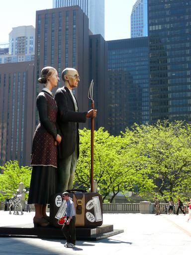Keywords: overdimensional statue woman man old fashioned farming chicago illinois building city usa farmer