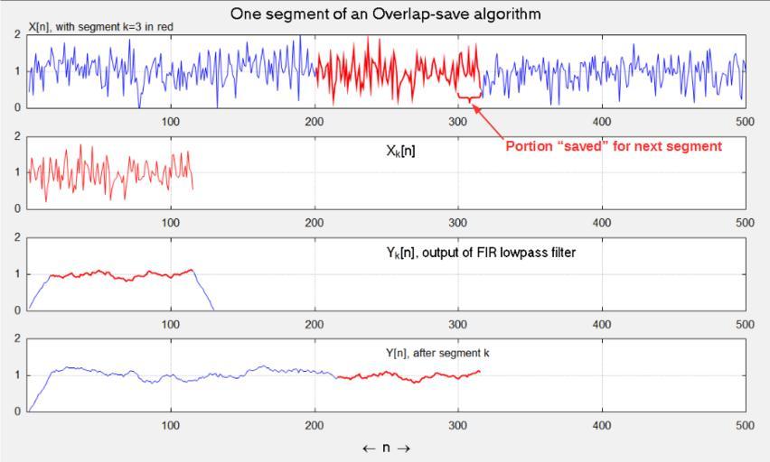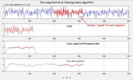 | Keywords: Overlap-save algorithm.png en A sequence of 4 plots depicts one cycle of the Overlap-save convolution algorithm The first plot is a long sequence of data to be processed with a lowpass FIR filter The 2nd plot is one segment of the data to be processed in piecewise fashion The 3rd plot is the filtered segment with the useable portion colored red The 4th plot is the output stream with the filtered segment appended to it 2013-02-16 19 53 46 own Bob K Octave script <source lang Matlab > graphics_toolkit gnuplot M 16; h ones 1 M /M; filter impulse response L 100; output segment length La 500; input data length a 1 + randn 1 La /3; data to be filtered seg 3; segment to be computed Xa seg-1 L + 1 L+M-1 ; indices of segment to be filtered figure 1 'color' 95 1 1 1 subplot 4 1 1 set gca 'FontSize' 10 plot 1 La a 'Color' 'blue' Xa a Xa 'color' 'red' 'linewidth' 2 set gca 'color' 'white' title 'One segment of an Overlap-save algorithm' 'FontSize' 14 ; text 1 2 2 'Xn with segment k 3 in red' xlim 0 La ylim 0 2 set gca 'XTick' 100 100 La set gca 'YTick' 0 2 grid 'on' subplot 4 1 2 set gca 'FontSize' 10 plot 1 L+M-1 a Xa 'Color' 'red' set gca 'color' 'white' text 250 1 6 'X_kn' 'FontSize' 12 xlim 0 La ylim 0 2 set gca 'YTick' 0 2 set gca 'XTick' 100 100 La grid 'on' Here we use the conv function to demonstrate just the overlap discard part of the process The efficiency of the algorithm is realized by replacing conv with circular convolution H fft h zeros 1 length Xa -M ; done only once in an iterative implementation b ifft H fft a Xa ; Note that length b is different for the two implementations Circular convolution folds the trailing transition region fall time back onto the rise time transition region subplot 4 1 3 b conv a Xa h ; Xb M-1 + 1 L ; set gca 'FontSize' 10 plot 1 length b b 'Color' 'blue' Xb b Xb 'Color' 'red' 'linewidth' 2 ; set gca 'color' 'white' text 250 1 6 'Y_kn output of FIR lowpass filter' 'FontSize' 12 ; xlim 0 La ylim 0 2 set gca 'YTick' 0 2 set gca 'XTick' 100 100 La grid 'on' subplot 4 1 4 c conv a h ; Xc1 1 M-1 + seg L; Xc2 M-1 + seg-1 L + 1 L ; set gca 'FontSize' 10 plot Xc1 c Xc1 'Color' 'blue' Xc2 c Xc2 'Color' 'red' 'linewidth' 2 set gca 'color' 'white' text 250 1 6 'Yn after segment k' xlim 0 La ylim 0 2 set gca 'YTick' 0 2 set gca 'XTick' 100 100 La grid 'on' xlabel '\leftarrow n \rightarrow' 'FontSize' 12 </source> cc-zero Uploaded with UploadWizard Signal processing Convolution |
