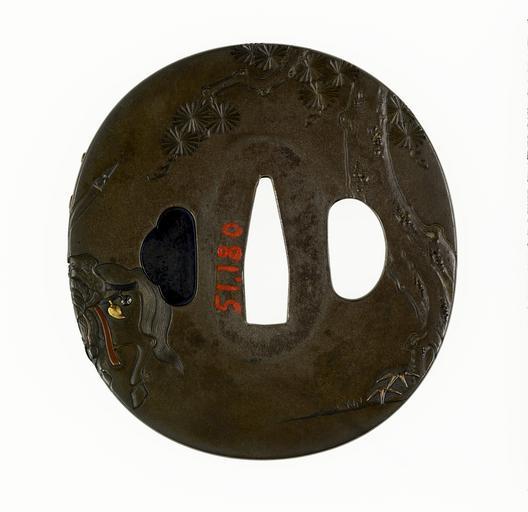 Keywords: Oyama Motozane I - Tsuba with the Chinese General Kanyu on His Horse - Walters 51180 - Back.jpg The mounted figure along the right edge of this tsuba is 2nd-century Chinese general Kanyu Ch Guan Yu Kuan Yu Stories of his activities during the Three Kingdoms period are told in the 14th-century novel Romance of the Three Kingdoms He is recognizable by his long black beard He was sometimes called Lord of the Splendid Black Beard On the reverse of the tsuba is the back of his horse and a pine tree between 1741 1830 Edo shibuichi copper gold silver shakudo cm 7 15 6 68 0 39 accession number 51 180 15185 Henry Walters Baltimore date and mode of acquisition unknown Walters Art Museum Henry Walters Acquired by Henry Walters Signature Sekijoken/Motozane with kakihan place of origin Edo present-day Tokyo Japan Walters Art Museum license Tsuba in the Walters Art Museum Oyama Motozane I Media contributed by the Walters Art Museum needs category review |