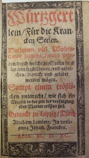 Keywords: P16-1238 Medpro Würzgärtlein für die kranken Seelen.jpg de Würzgärtlein für die kranken Seelen Darinnen viel wohlriechende heilsame Kräuter zu finden durch welche die Seelen in allen ihren Krankheiten und Gebrechen erquickt und gelabet werden mögen Samt einem tröstlichen Unterricht wie sich ein Mensch in der Zeit der Verfolgung oder Marter trösten soll Gedruckt zu Leipzig durch Abraham Lamberg in Vorlegung Johannes Francken anno MDXC https //www flickr com/photos/mediathequeprotestante/6382383341/ P16-1238 1590 https //www flickr com/people/66690468 N02 Medpro PD-old-100 Leoboudv 2016-11-28 Images from Médiathèque protestante de Strasbourg 1590 books single pages |