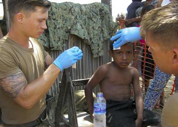 Keywords: Pacific Deployment 2015 150918-N-DC245-008.jpg en 150918-N-DC245-008 LIQUICA Timor-Leste Sep 18 2015 Naval Mobile Construction Battalion NMCB 3 s Timor-Leste Civic Construction Action Detail CCAD Construction Electrician 3rd Class Jayke Boughton and SteelWorker 2nd class Spenser Hawks help cleanup a young boy who was injured during a soccer game being played near the Tibar Primary School U S Navy photo by Builder 3rd Class William Coney IV/Released <br>Unit Naval Mobile Construction Battalion 3 2015-09-18 William Coney https //www dvidshub net/image/2198338/pacific-deployment-2015 150918-N-DC245-008 2015-09-28 09 53 LIQUICA TL PD-USGov-Military-Navy Naval Mobile Construction Battalion 3 Images from DoD uploaded by FĂŚ |