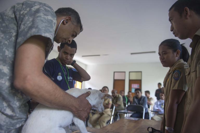 Keywords: Pacific Partnership 2014 140602-N-IL267-109.jpg en U S Army Maj Raghavan Sampathkumaran a veterinarian from Lompoc Calif assigned to the 109th Medical Detachment Veterinary Services takes a dog's heart rate for a pre-surgery physical examination as part of a veterinarian subject matter expert exchange at Dinas Peternakan Rote Ndao veterinarian clinic in Ba'a Indonesia during Pacific Partnership 2014 Pacific Partnership is in its ninth iteration and is the largest annual multilateral humanitarian assistance and disaster relief preparedness mission conducted in the Asia-Pacific region U S Navy photo by Mass Communication Specialist 1st Class Dustin Q Diaz/Released 2014-06-02 Petty Officer 1st Class Dustin Diaz https //www dvidshub net/image/1376595 140602-N-IL267-109 2014-06-03 06 00 BA'A ID PD-USGov-Military-Navy Pacific Partnership 2014 Images from DoD uploaded by Fæ |