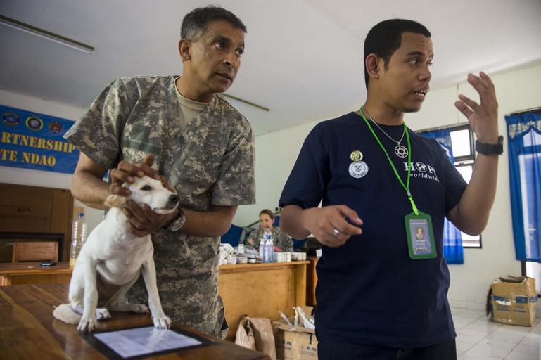 Keywords: Pacific Partnership 2014 140602-N-IL267-101.jpg en U S Army Maj Raghavan Sampathkumaran a veterinarian from Lompoc Calif assigned to the 109th Medical Detachment Veterinary Services performs a pre-surgery physical examination on a dog while Jack Loloin a volunteer interpreter from Hope Worldwide translates for Indonesian animal doctors and veterinarian medics as part of a veterinarian subject matter expert exchange at Dinas Peternakan Rote Ndao veterinarian clinic in Ba'a Indonesia during Pacific Partnership 2014 Pacific Partnership is in its ninth iteration and is the largest annual multilateral humanitarian assistance and disaster relief preparedness mission conducted in the Asia-Pacific region U S Navy photo by Mass Communication Specialist 1st Class Dustin Q Diaz/Released <br>Unit Expeditionary Combat Camera 2014-06-02 Petty Officer 1st Class Dustin Diaz https //www dvidshub net/image/1376586/pacific-partnership-2014 140602-N-IL267-101 2014-06-03 06 16 BA'A ID PD-USGov-Military-Navy Pacific Partnership 2014 Images from DoD uploaded by Fæ |