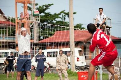 | Keywords: Pacific Partnership 2014 140624-N-CF750-256.jpg en A Cambodian sailor spikes a ball against Japanese and U S service members during a Pacific Partnership 2014 sports day event in Sihanoukville Cambodia June 24 2014 Pacific Partnership is an annual deployment of forces designed to strengthen maritime and humanitarian partnerships during disaster relief operations while providing humanitarian medical dental and engineering assistance to nations of the Pacific U S Navy photo by Chief Mass Communication Specialist Greg Badger/Released Unit Defense Imagery Management Operations Center DVIDS Tags Foreign military; DIMOC; USAF; DVIDS Bulk Import 2014-06-24 Gregory Badger https //www dvidshub net/image/1418443/pacific-partnership-2014 140624-N-CF750-256 2014-06-26 00 31 SIHANOUKVILLE KH PD-USGov-Military-Navy Pacific Partnership 2014 Images from DoD uploaded by Fæ |