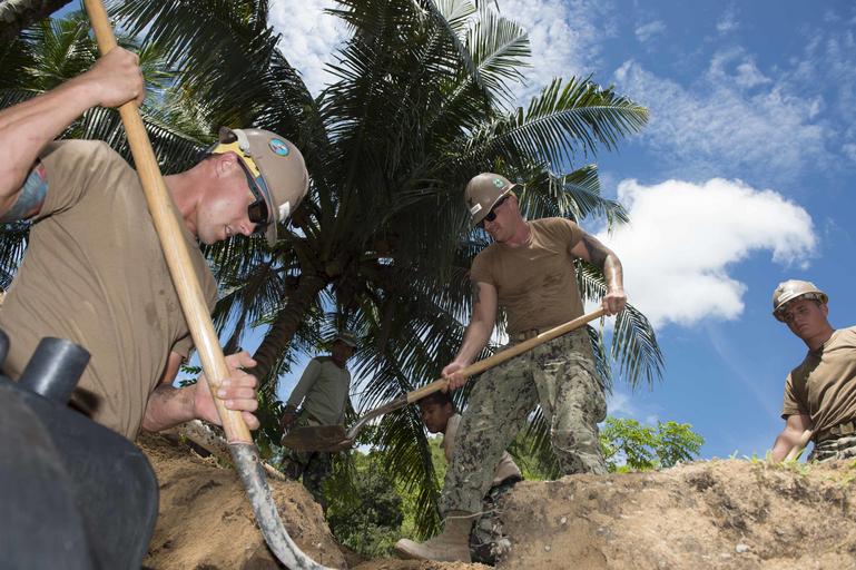 | Keywords: Pacific Partnership 2016 160820-N-SX983-623.jpg en 160820-N-SX983-623 SUNGAI PINANG Indonesia Aug 20 2016 Steelworker 3rd Class Kodey Jones left from Phoenix Builder 2nd Class Matthew Spence from Chicago and Construction Electrician 3rd Class Johnathon Dahman from Atlanta all attached to Amphibious Construction Battalion One dig a trench for pipes that will connect to a septic tank for a new public restroom in Sungai Pinang U S Navy Seabees attached to ACB 1 Naval Mobile Construction Battalion 4 and TNI Marines are working together to build a public restroom in Sungai Pinang during Pacific Partnership 2016 This is the fifth time Pacific Partnership has visited Indonesia Partner nations are working side-by-side with local organizations during disaster response training civil engineering projects Women Peace and Security seminars medical subject matter expert exchanges and a live field training exercise aimed at improving the capacity of local government civilian agencies and partner militaries to collectively respond in crisis U S Navy photo by Mass Communication Specialist 2nd Class Lindsey E Skelton/Released <br>Unit Defense Imagery Management Operations Center 2016-08-20 Seaman Lindsey Skelton https //www dvidshub net/image/2814935/pacific-partnership-2016 160820-N-SX983-623 2016-08-24 21 35 SUNGAI PINANG PADANG ID PD-USGov-Military-Navy Pacific Partnership 2016 United States Navy Seabees Images from DoD uploaded by Fæ |