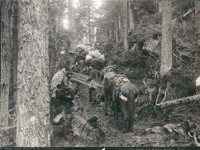 Keywords: Packtrains on the Chilkoot Trail blocked by a fallen horse, Alaska, 1897 (LAROCHE 88).jpeg check categories 8 June 2016 4 Photograph Creator Frank La Roche Caption on image Dyea Trail blocked by falling horse c1897 A trying climb on Dyea Trail Mile after mile of such broken railway and uncertain footing is met with en route to the mountain top The photographer was shown the toilsome march of the pack train bearing supplies for the miners At the moment this photograph was taken a fallen horse in front of the line had compelled all behind it to stop until the animal was assisted to regain its feet In this picture can be seen two men carrying a section of a boat Later even this light load became to great to be borne up the mountain side and they were compelled to saw it in two pieces and divide the burden On reaching the shores of the lake the pieces of the boat were patched together again Frank La Roche En Route to the Klondike 1898 Klondike Gold Rush La Roche 2030 Subjects LCTGM Packtrains--Alaska; Pack animals--Alaska; Horses--Alaska Subjects LCSH Chilkoot Trail; Trails--Alaska depicted place Alaska 1897 Institution University of Washington UWASH-LAROCHE-source accession number laroche 88 PD-old-auto-1923 1936 Information field Order Number LAR207 Images from the Frank La Roche Photographs Collection to check Pack animals Horses Chilkoot Trail Trails |