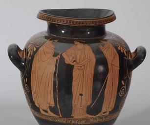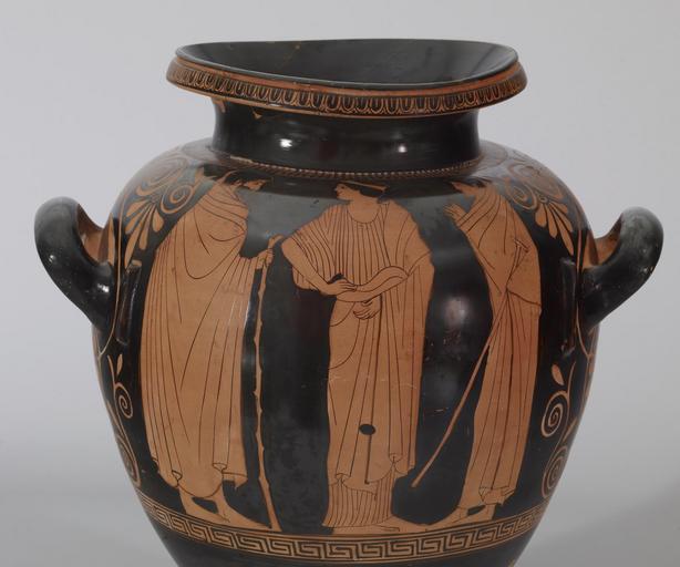 | Keywords: Painter of the Florence Stamnoi - Red-figure Stamnos with Eos and Two Youths - Walters 482034 - Side B Detail A.jpg His lyre tumbling to the ground the youth Cephalus flees the amorous goddess Eos She grabs his neck while fingering her mantle in the traditional gesture of a demure bride This theme was a popular subject for red-figure vessels from the early to mid 5th century BC This stamnos wine container belongs to a class of vessels which has a low foot in the form of a ring There are seven known stamnoi of this type All have the same size and proportions and were probably fashioned by the same potter between 470 460 BC Classical terracotta cm 36 3 19 3 accession number 48 2034 35108 Robert Garrett Collection date and mode of acquisition unknown Walters Art Museum 1951 by purchase Museum purchase 1951 Translation KALOS Pandora's Box Women in Classical Greece The Walters Art Gallery Baltimore; Dallas Museum of Art Dallas; Antikenmuseum Basel und Sammlung Ludwig Basel 1995-1996 Déjà Vu Recurrence The Walters Art Museum Baltimore 2007-2008 Heroes Mortals and Myths in Ancient Greece The Walters Art Museum Baltimore; Frist Center for the Visual Arts Nashville; San Diego Museum Of Art San Diego; Alexander S Onassis Public Benefit Foundation USA New York 2009-2011 place of origin Athens Greece Walters Art Museum license Ancient Greek red-figure pottery in the Walters Art Museum Painter of the Florence Stamnoi Media contributed by the Walters Art Museum needs category review |