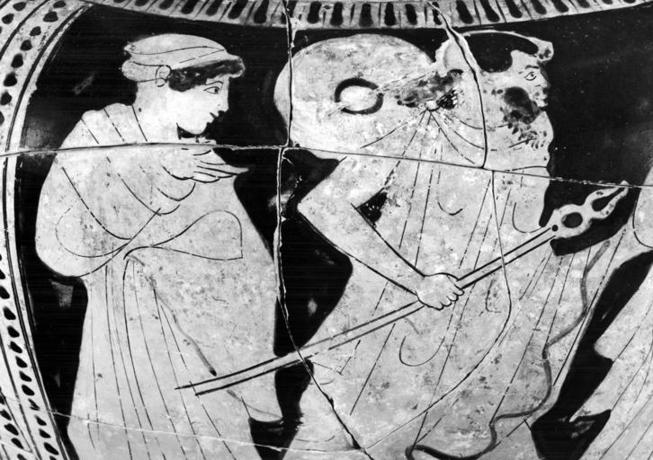 | Keywords: Painter of Syracuse 23510 - Column-Krater with Hermes and the Komos - Walters 4869 - Side A Detail.jpg This red-figure column-krater depicts Hermes on the front He is pursuing a woman possibly Herse to the right He is bearded and dressed in a chlamys with a brooch and winged boots and has a petasos hanging down his back from his neck In his right hand he holds a kerykeion at waist level and he grasps her right arm with his left Dressed in a chiton mantle and sakkos she moves right looking around her left hand extended in front On the right stands a bearded elderly man possibly Kekrops wearing a chiton fillet and mantle He holds a scepter upright in his right hand and faces left On the far left a female companion possibly Aglauros flees left looking around She wears a chiton mantle and sakkos Her right hand protrudes from the drapery beneath her chin On the back is a komos On the left a mantled youth moves right a skyphos in his left hand In the center another youth moves right looking around He also holds out a skyphos in his left hand but he gestures with his right at his side On the right a third mantled youth stands to the left holding a staff diagonally across his body His left hand is covered with his mantle and he gestures with his raised right hand The first two wear fillets the paint used to indicate them now mostly lost On the rim in silhouette are three pairs of confronted lions and boars Hermes pursuing a woman is found on a number of early classical and classical red-figure vases but none has an inscription naming the woman; thus her identity is uncertain Most likely the woman he pursues on these vases is one of the Aglaurids possibly Herse while the king must be Kekrops and the other woman one of her sisters Aglauros or Pandrosos ca 460 BC Classical terracotta cm 43 6 35 3 h x max diam ; at mouth cm 36 9 diam ; at foot cm 1737 diam accession number 48 69 9351 Don Marcello Massarenti Collection Rome date and mode of acquisition unknown cat no 191 Henry Walters city Baltimore Walters Art Museum Henry Walters Acquired by Henry Walters with the Massarenti Collection 1902 place of origin Attica Greece Walters Art Museum license Ancient Greek red-figure pottery in the Walters Art Museum Painter of Syracuse 23510 Media contributed by the Walters Art Museum needs category review Media contributed by the Walters Art Museum needs artist update Hermes in ancient Greek pottery |