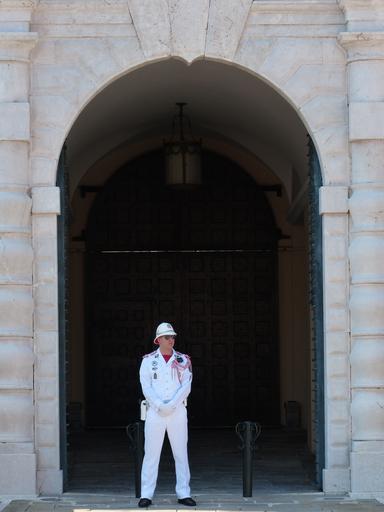 Keywords: palace guard guard man human person uniform white prince palace monaco palace grimaldi residence prince city building architecture