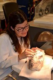 Keywords: paleontology labwork geology indoor Guest Scientist, Alaina Fike, is in the Paleo Prep lab at Badlands National Park, South Dakota, and shows a Hyracodon skull being prepped using hand tools. (NPS Photo by Alaina Fike, GIP) Guest Scientist, Alaina Fike, is in the Paleo Prep lab at Badlands National Park, South Dakota, and shows a Hyracodon skull being prepped using hand tools. (NPS Photo by Alaina Fike, GIP) |