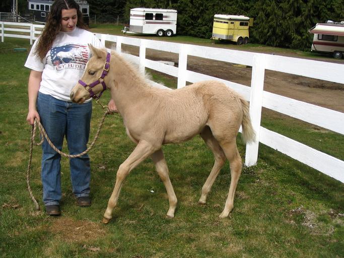 Keywords: horses palomino colt animal outdoor In this picture the colt, named Bear, is about two months old. He is accompanied by a stablehand holding his lead. CC0 waiver: To the extent possible under law, I waive all copyright and related or neighboring rights to this work. In this picture the colt, named Bear, is about two months old. He is accompanied by a stablehand holding his lead. CC0 waiver: To the extent possible under law, I waive all copyright and related or neighboring rights to this work.