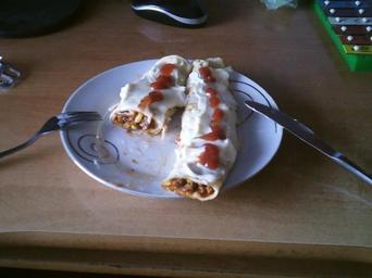 Keywords: Pancakes in Poland.JPG pl Naleśniki z mięsem i kukurydzą oblane majonezem i keczapem 2014-02-09 15 19 12 own Batorry cc-zero Maize-based food in Poland Uploaded with UploadWizard Pancakes of Poland Rolled pancakes Ketchup Mayonnaise Maize-based food Meat dishes of Poland