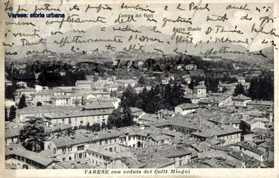 Keywords: Vista del centro città e del colle Miogni ripreso probabilmente dal campanile di San Vittore. Il piantone di via Veratti angolo via Del Cairo è ancora giovane e al posto dell'istituto salesiano alle cinque vie (ora piazza don Bosco) un giardino con piante di alto fusto. varese |