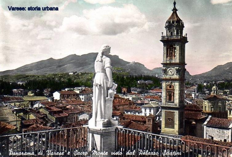 Keywords: Versione colorata. Vista del centro di Varese, con la piazza San Vittore antecedente alla costruzione del palazzo della Cariplo (ing. Angiolini, 1937), ripresa da palazzo Sciarini (arch. Aldo Scala e ing. Antonino Mazzoni, 1930-33). Sullo sfondo il colle Miogni con villa Mylius e, in secondo piano Sacro Monte e Campo dei Fiori.
