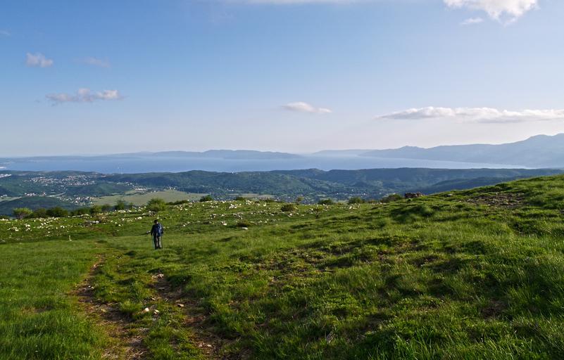 Keywords: panorama hiker hiking mountain adventure activity achievement alone day grass green field sky