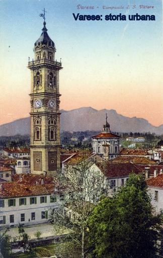 Keywords: Versione colorata. Vista sul campanile ed il tiburio di San Vittore (entrambe opere dell' arch. Giuseppe Bernasconi). In secondo piano, a destra del tiburio, villa Mylius sul colle Miogni. A destra, seminascosto dagli alberi, l'edificio multipiano era l'antico palazzo arcivescovile (citato per la prima volta nel 1179) costruito dietro il battistero di San Giovanni Battista, abbattuto negli anni '60 per realizzare la sede di un istituto bancario (la ex Banca Popolare di Luino e di Varese). varese |