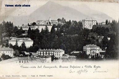 Keywords: Vista su Biumo Superiore. In alto la chiesa di San Giorgio, sotto la quale si ergono le ville Panza-Litta-Menafoglio (a sinistra) e Ponti (a destra). Poco sotto villa Panza, all'estrema sinistra villa San Francesco con timpano triangolare. Più in basso l'edificio ad u con al centro la torretta con campana ospitava le scuole civiche (sostituite dal palazzo del tribunale) e davanti al quale era posta la statua dedicata ai Cacciatori delle Alpi (spostata nel 1901 in piazza Podestà ). A destra sorge isolata villa Dandolo (ora Selene). varese |