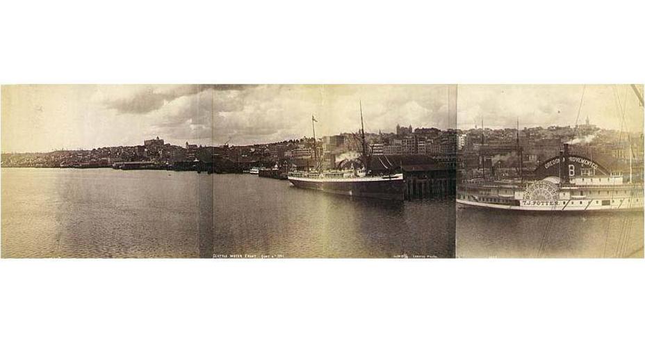 | Keywords: Panorama of the waterfront north from Main St, Seattle, Washington, June 6, 1891 (LAROCHE 112).jpeg Photograph Creator Frank La Roche Caption on image Seattle water front June 6th 1891 3 part panorama La Roche 1001 La Roche 1001 1/2 La Roche 1001 3/4 Shows steamboat T J POTTER right at the Union Pacific dock or City dock foot of Main ; steamer WALLA WALLA center at the Ocean dock foot of Washington ; and the Oregon Improvement Company Subjects LCTGM Ships--Washington State --Seattle; Harbors--Washington State --Seattle; Waterfronts--Washington State --Seattle Subjects LCSH Seattle Wash ; T J Potter Ship ; Oregon Improvement Company; Photography panoramic--Washington State --Seattle depicted place Seattle Washington 1891 Institution University of Washington UWASH-LAROCHE-source accession number laroche 112 PD-old-auto-1923 1936 Information field Order Number LAR278 other versions Panorama of the waterfront north from Main St Seattle Washington June 6 1891 LAROCHE 345 jpeg Walla Walla ship 1881 T J Potter ship 1888 Ships in Elliott Bay Panoramics in Seattle Old Seattle skylines Downtown Seattle Washington Central Waterfront Seattle Washington Oregon Improvement Company piers Seattle 1891 in Seattle Black and white photographs ImageNote 1 200 187 35 23 906 500 2 Denny later Washington Hotel ImageNoteEnd 1 ImageNote 2 553 174 35 20 906 500 2 Rainier Hotel ImageNoteEnd 2 ImageNote 3 807 161 39 24 906 500 2 King County Courthouse ImageNoteEnd 3 |