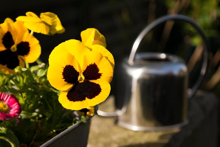 Keywords: pansy watering can yellow brown silver pot blossom bloom flower garden flower garden bloom rays light